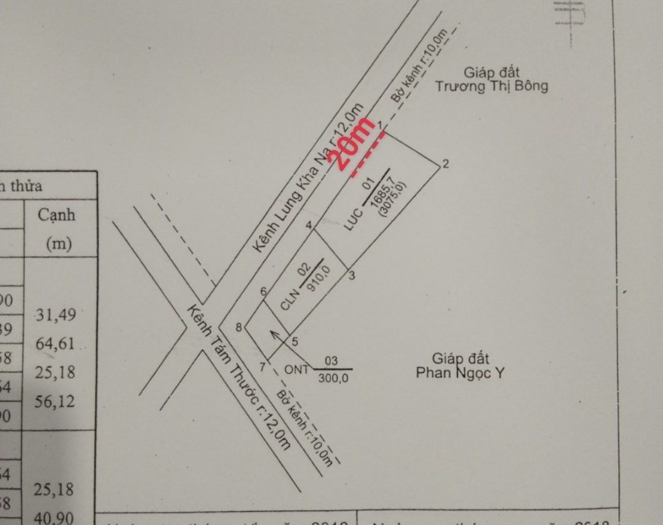 Thửa đất cần bán thuộc ấp Cống Tre, xã Kiên Bình, huyện Kiên Lương, tỉnh Kiên Giang. Mặt tiền nằm trên Kênh Lung Kha Na R:12.0m, bờ kênh r:10 m đối diện đường An Dương Vương.Chủ đất cần bán 20m ngang * dài 31.49m. Đặc biệt nằm cách quốc lộ 80 2km. Đường Kênh Tám Thước đang trong tiến trình nâng cấp đường lộ rộng 14m thuận tiện cho mọi loại xe cơ giới lưu thông. Cơ sở hạ tầng đầy đủ. Nơi đây không khí trong lành, thích hợp xây nhà ở hoặc đầu tư lâu dài. Bao sang sổ lên thổ cư.