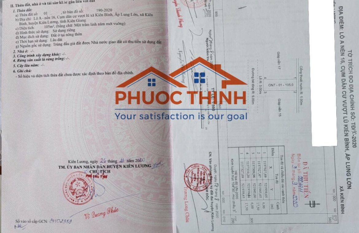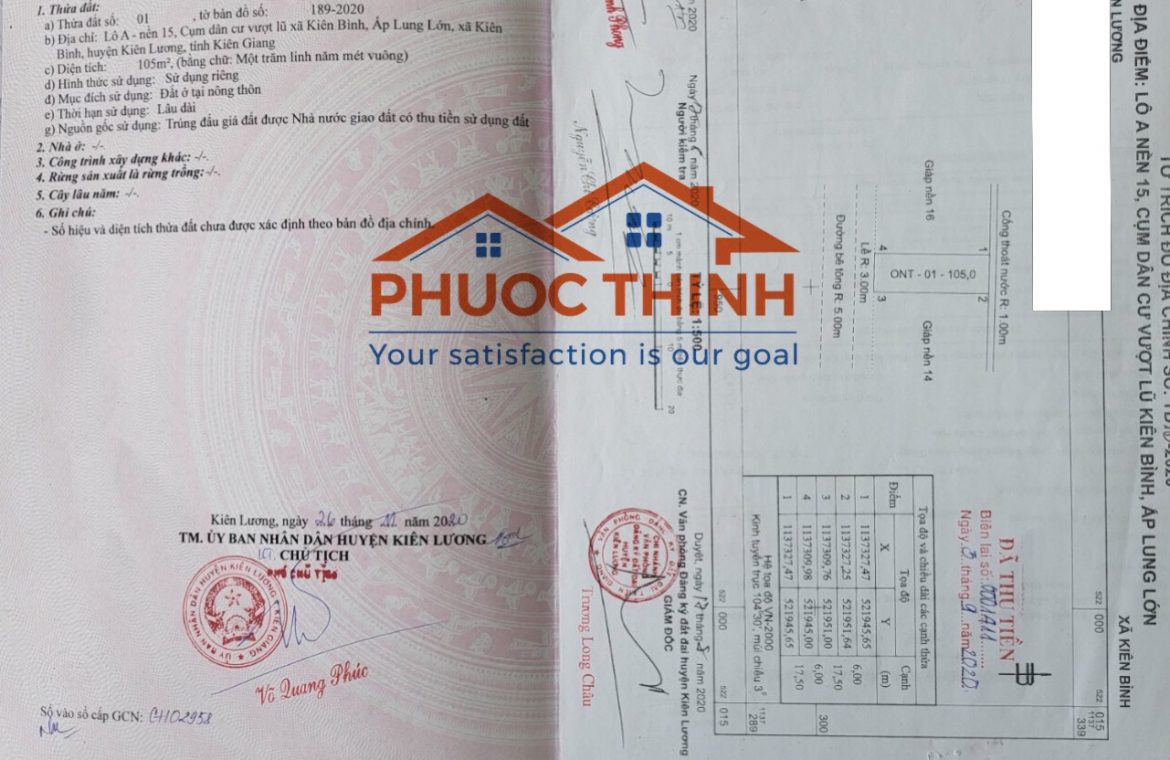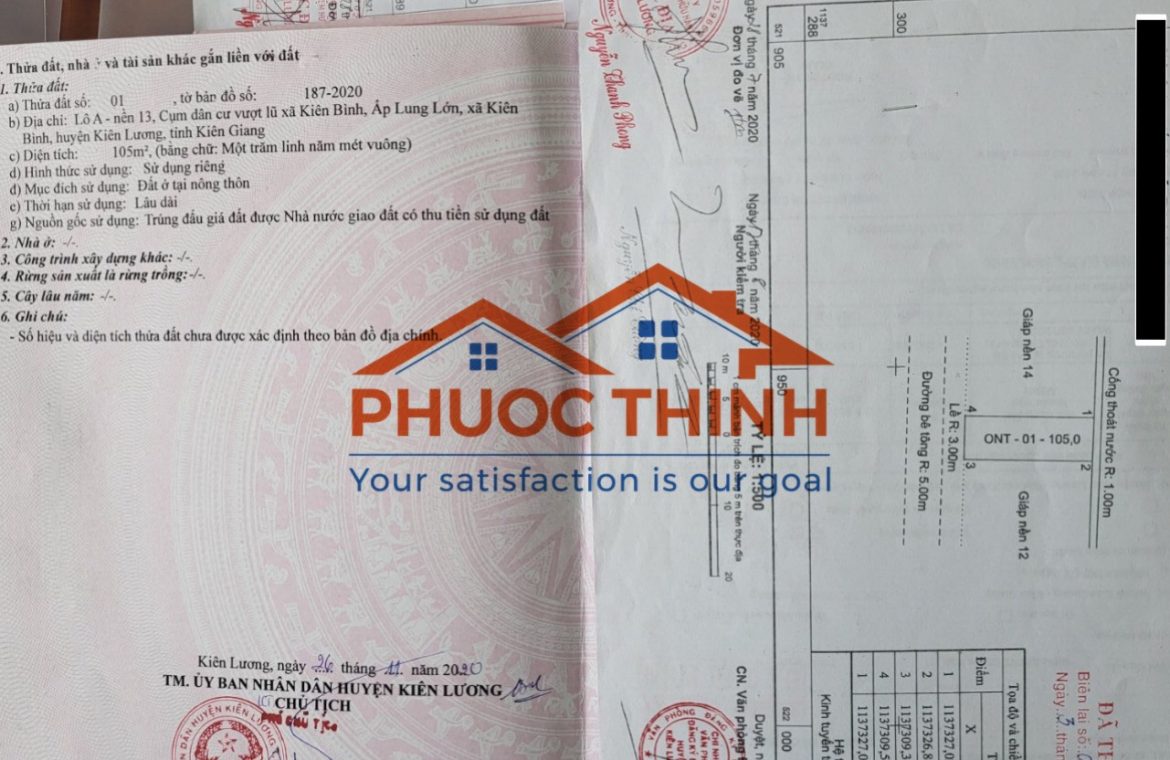 Nền đất tọa lạc tại Lô A – nền 13, 14, 15, 16, Cụm dân cư Vượt Lũ xã Kiên Bình, ấp Lung Lớn, xã Kiên Bình, huyện Kiên Lương, tỉnh Kiên Giang. Đường bê tông rộng 5m, vỉa hè 3m.