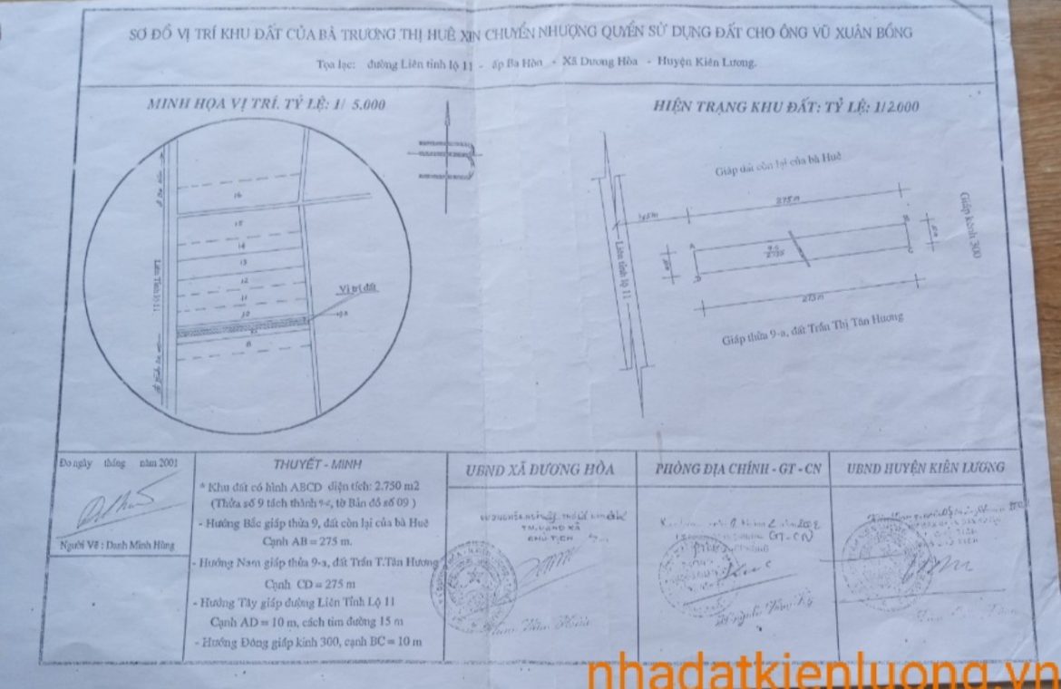 Nền đất mặt tiền cần bán nằm trên đường tỉnh lộ 11 R:10m, hành lang lộ giới rộng 10m thuộc TT. Kiên Lương, H. Kiên Lương, T.Kiên Giang. Diện tích 2750 m²( Dài 275m * Ngang 10m).Phạm vi 400m là cầu Moso, cách 3km là Trung Tâm Thương Mại Ba Hòn và TTHC Ba Hòn. Khu vực này là nơi tập trung dân cư đông đúc, an ninh cao vì vị trí nằm tại trục đường quốc lộ,nền diện tích lớn. Cơ sở hạ tầng “Điện – Đường- Trường – Trạm” đầy đủ. Nơi đây không khí trong lành. Nền nằm mặt tiền đường quốc lộ lớn nên phù hợp cho khách hàng thích kinh doanh nhà nghỉ, phòng karaoke, mở quán nhậu, cửa hàng, nhà kho, nhà yến hoặc đầu tư lâu dài…